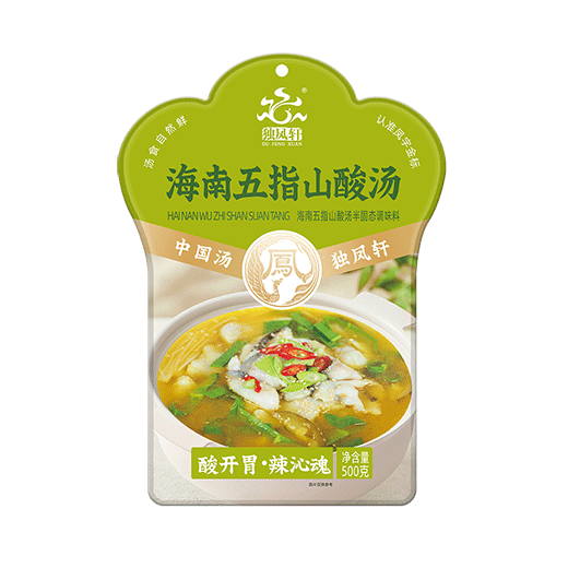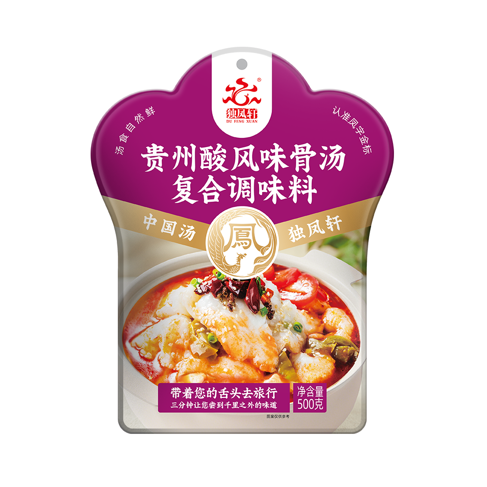 是以贵州凯里野山毛辣果 、糯米 、 红辣椒发酵制成的传统红酸汤为主要原料, 配以清爽鸡汤, 蕃茄 、 野山椒等调味料精制而成。 由于野生毛辣果发酵产生乳酸菌,使得汤底酸味口感纯正, 酸中带辣, 口感浓郁, 开胃健脾。